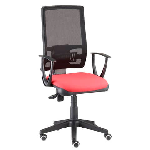Struttura in acciaio nero, guscio inferiore in PPL nero, base in acciaio. Rivestimento del sedile in tessuto Eco, 100% Polipropilene 380g m/l, di colore rosso. Con ruote, braccioli regolabili inclusi.