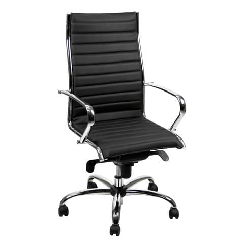 Poltrona direzionale girevole con elevazione a gas - meccanismo oscillante con 4 blocchi anti shock con fulcro avanzato; rivestimento seduta in tessuto ''top - vera pelle smerigliata''. In fibra modacrilica e reazione al fuoco classe 1. Schienale alto e base in acciaio. Meccanismo oscillante con fulcro avanzato. Braccioli in acciaio cromato inclusi (non rimovibili ed elevazione a gas. Altezza totale: 105-116cm; profondita' tot: 68cm; alt
