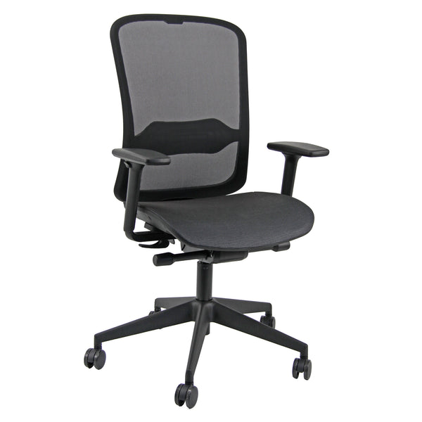 Sedia girevole su ruote con sedile in rete portante e schienale in rete nera, elevazione a gas. Supporto lombare regolabile, meccanismo syncro tra sedile e schienale, a contatto permanente. Schienale con ritorno controllato con 4 blocchi antishock. Sedile dotato di traslatore (avanti e indietro. Completa di braccioli regolabili. Alt.tot: 105-107cm; prof.tot: 68cm; alt.schienale: 60cm; largh.schienale:47cm; largh.sedile: 48cm; prof.sedile: 46cm; alt.sedile: 40-52cm.