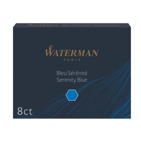 Lascia che le tue idee fluiscano liberamente sulla pagina con una gamma di inchiostri unici e avventurosi come la tua immaginazione. Formula di alta qualità per prestazioni e comfort di scrittura superiori. Compatibile con tutte le penne stilografiche Waterman. Scatola da 8 cartucce d'inchiostro. Colore: blu.