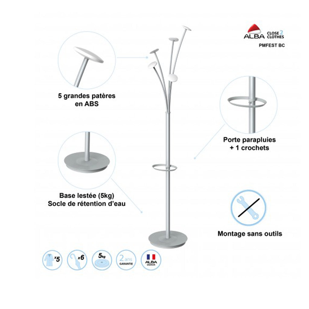 Appendiabiti in acciaio e abs con base appesantita. Dotato di 5 supporti abito e portaombrelli con raccogli acqua. Dimensioni: altezza 187cm base da 5kg con diametro 35,5cm