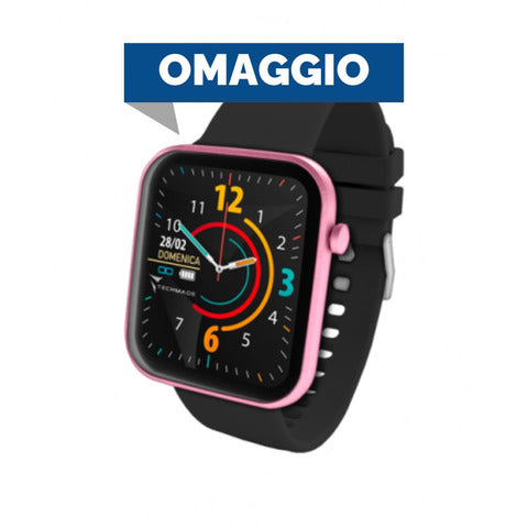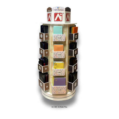 Espositore girevole in polionda, misure 30 x 30 x 70 cm. Composizione: 6 linee prodotto (pastello, scuro RFID, JPP, Classic, Color, Skin), 4 articoli per ciascuna linea, 24 articoli differenti. Assortimento: portacarte, portatessere e portadocumenti in formati e colori assortiti. Incluso nell'acquisto dell'espositore un omaggio dal valore di 89,99 euro. Uno smartwatch Techmade (fino a esaurimento scorte).