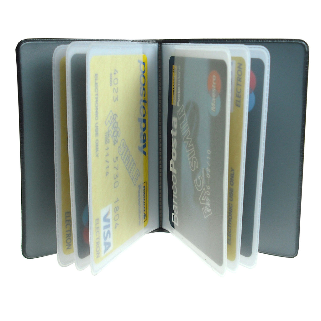Portacard protezione contactless a libro 14 scomparti. Copertina in pvc espanso finitura fibra di carbonio spessore 1,3 mm. Tasche interne in pvc antistatico, stampa a caldo inargento opaco.