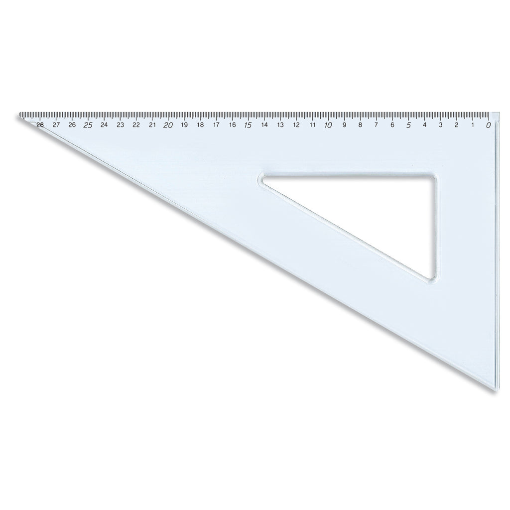 Squadra in materiale plastico. Smusso tirachina e bordo interno. Punte arrotondate di sicurezza. Con milimetratura speciale invertita da destra verso sinistra.