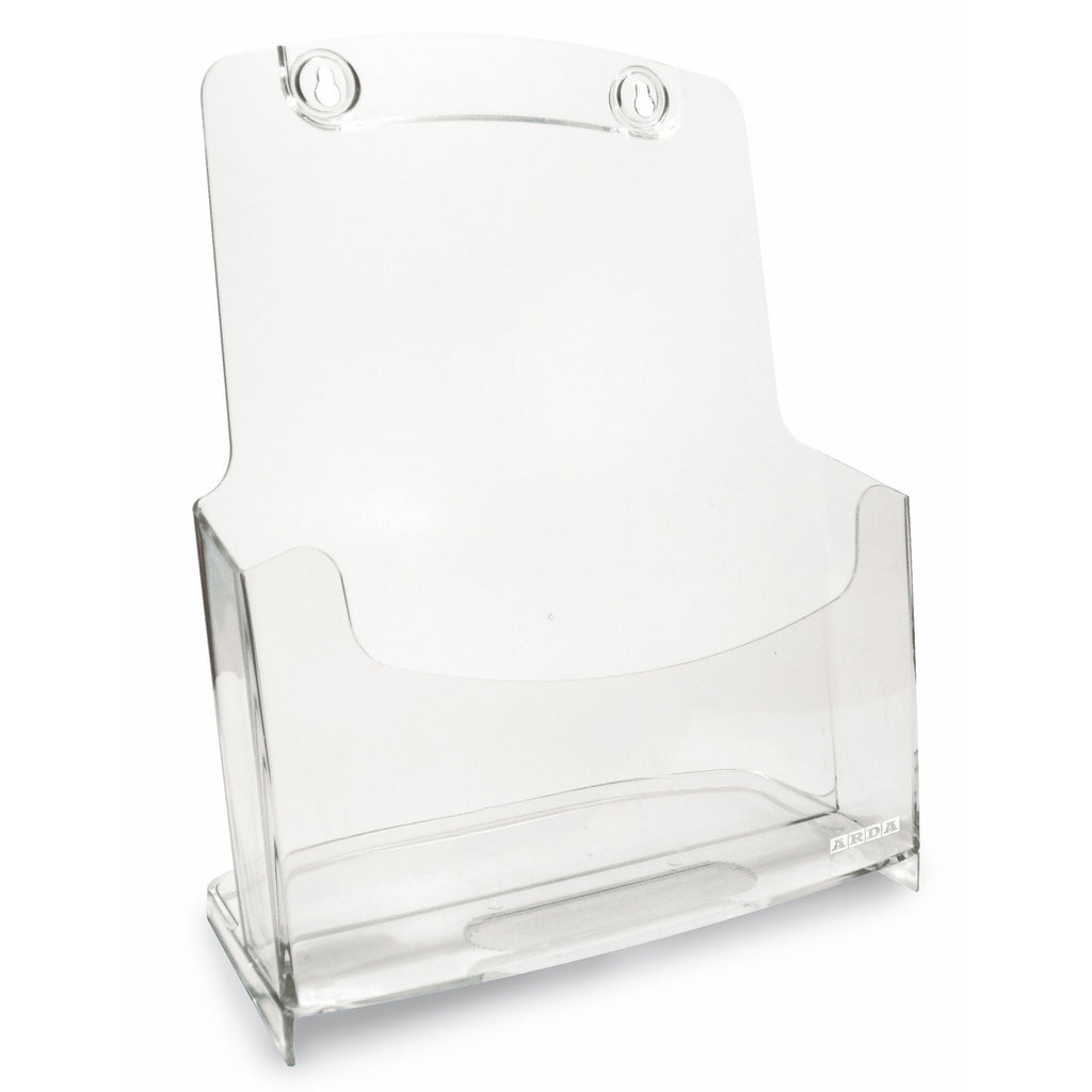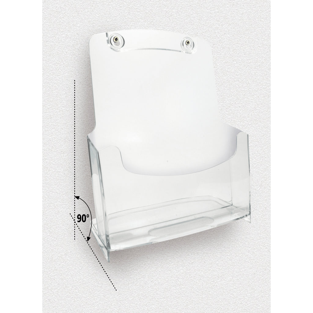 Portadepliant da parete e da banco a tasca singola f.to a4. Design pulito ed essenziale, possono entrare uno nell'altro cosi' da guadagnare spazio sul banco. In materiale plastico perfettamente trasparente con dorso leggermente inclinato per garantire la massima stabilita' del materiale esposto. Accoppiabili ad incastro e appendibili a parete. Dimensione 23,7x28,3x12cm.