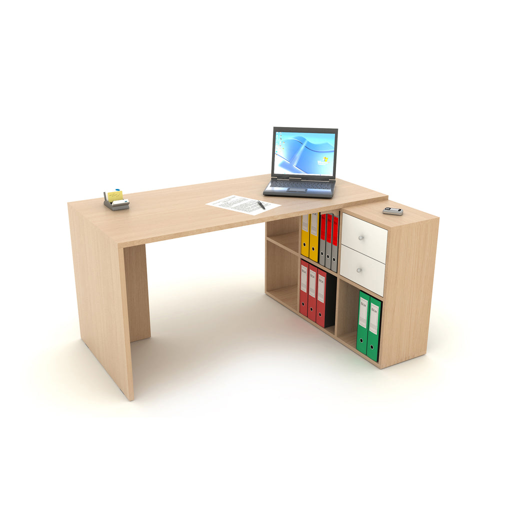 Postazione home-office l140 x p104 x h72,4cm. Tavolo 140x69cm - h72,4cm. Casellario 104x29,2cm - h 69,8cm. Realizzata in melaminico bilaminato antigraffio e antiriflesso (sp. Da 16 a 22 mm). L’ampia superficie di lavoro (140 x 69 cm, sp. 22 mm) e' sorretta da un lato da un solido fianco (sp. 22 mm) e dall’altro da una pratica libreria a 6 o a 9 caselle (sp. 16 mm). Le librerie sono completabili con set 2 cassetti, set 2 antine in melaminico e antina in vetro collocabili all’interno delle caselle.