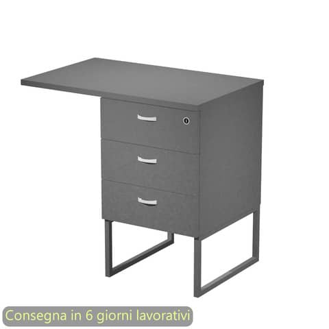 Cassettiera alta a 3 cassetti antracite laguna con Top posizionabile in 2 modi, su supporto in metallo antracite opaco. Fornita montata. Il supporto in metallo è da montare. La serratura si trova sul primo cassetto. I cassetti hanno guide metalliche con fermo a fine corsa. I piedini sono regolabili, in modo da permettere il posizionamento della cassettiera sotto il piano della scrivania. Dimensioni: 80x50/50X80xH.74,4 cm(in base a come viene posizionato il Top). Produzione interna Artexport della parte in legno certificata Iso 9001. Certificazioni FSC e PEFC. Imballi totalmente in cartone per un facile riciclo, a basso impatto ambientale.
