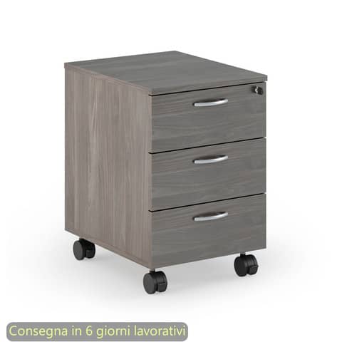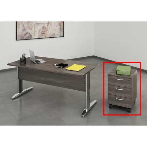 Cassettiera a 3 cassetti della serie Presto, una linea economica ma caratterizzata da soluzioni tecniche di livello superiore. Cassetti scorrevoli su guide metalliche con fermo a fine corsa, di cui il primo fornito anche di serratura. Con ruote pivotanti, montate e con freno.