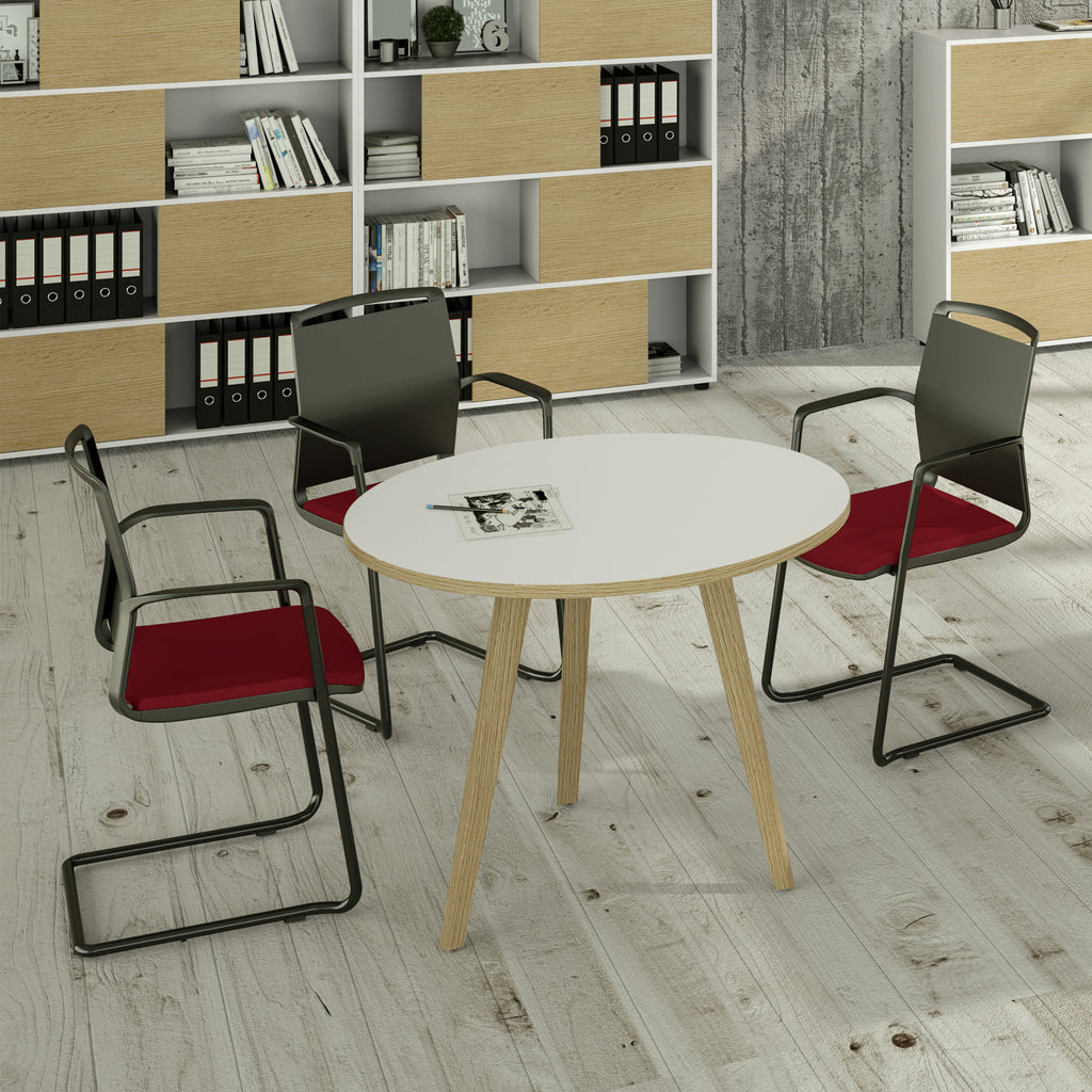 Linea di arredo operativo dal design confortevole ed essenziale caratterizzata dalle preziose gambe in legno massello inclinate delle scrivanie e dei tavoli rotondi. Robusti piani in melaminico sp. 22 mm con bordo antishock resistente agli urti in abs 3 mm. Gambe in legno massello complete di piedini livellabili in altezza. Piani in materiale bilaminato nobilitato melaminico spessore 22 mm conforme norme uni e en classe e1