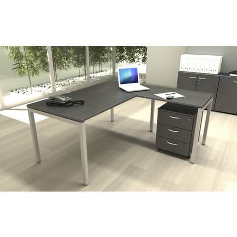 Realizzata in materiale bilaminato nobilitato melaminico, con piano di spessore 22 mm, antigraffio e antiriflesso. Bordo dei piani in ABS antishock di 3 mm di spessore, antiurto e senza spigoli vivi. Gambe a sezione quadrata 40x40 mm, in metallo verniciato a polveri epossidiche di colore grigio alluminio, complete di piedini regolabili in altezza. Le gambe sono unite da una traversa in metallo centrale rispetto al piano. Non essendoci quindi gambe centrali c’è più libertà di movimento