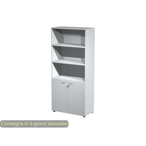 Realizzato in robusto melaminico bilaminato antigraffio ed antiriflesso, con ante basse battenti in melaminico spessore 18 mm, con serratura. Struttura di spessore 18 mm. Maniglie in ABS antiurto finitura alluminio. Dotato di 4 solidi ripiani ad alto spessore (25 mm), 3 riposizionabili ed 1 fisso (il secondo dal basso). Profondità utile dei ripiani 42,5 cm. Rifinito posteriormente, con spessore del dietro rigido di 10 mm, può essere utilizzato come parete divisoria. Dotato di piedini regolabili in altezza per un perfetto livellamento col pavimento.