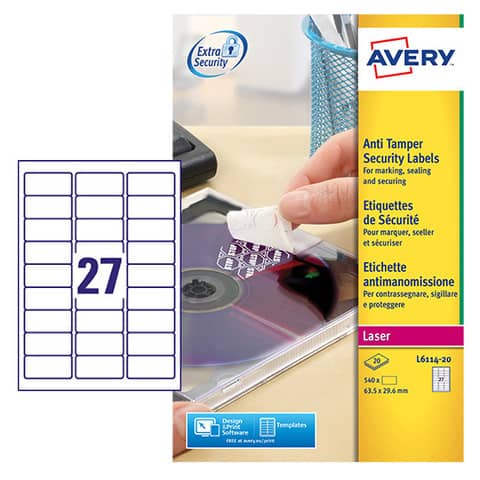 Etichette bianche antimanomissione in poliestere, adatte a stampanti Laser in bianco e nero o a colori. Desideri tenere al sicuro informazioni riservate? Scegli le etichette antimanomissione di Avery, ideali per garantire la sicurezza di informazioni riservate e di beni aziendali. Adesivo permanente. Se si tenta di rimuovere l'etichetta sulla superficie rimane impressa la scritta ''STOP'' rendendo facilmente visibile il tentativo di manomissione del prodotto. Sono ultra resistenti, resistono all'acqua, allo sporco, agli agenti chimici, ai raggi UV, all'olio, agli strappi, a temperature da -40°C a +90°C. Facili da stampare con il software e modelli preimpostati gratuiti Avery Crea & Stampa. Formato 63,5x29,6 mm, 27 etichette per foglio, confezione da 20 fogli, 540 etichette complessive. Perfette per sigillare prodotti, documenti ed attrezzature, ideali come sigilli di manutenzione o d’ispezione o per contrassegnare un prodotto originale come autentico, per applicazioni interne ed esterne. Possono essere applicate su metallo, plastica, superfici dipinte, policarbonato e vetro.
