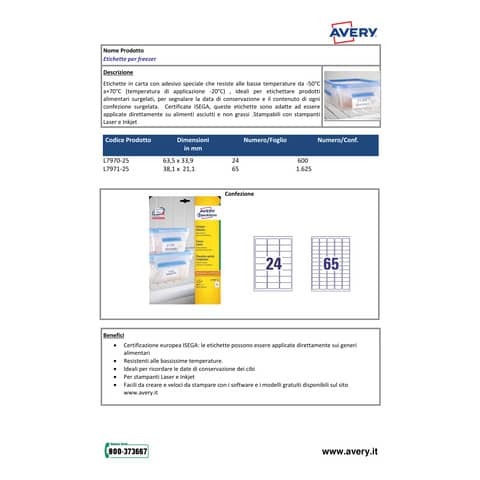 Etichette bianche in carta specifiche per freezer, adatte a stampanti Laser e Inkjet. Hai il frigorifero sempre in disordine e non riesci a trovare nulla? Organizzati con le etichette per freezer Avery! Progettate per resistere in modo sicuro e affidabile a temperature sotto lo zero, anche se applicate su superfici irregolari. L'adesivo speciale di queste etichette inoltre è idoneo al contatto diretto con gli alimenti secchi, non grassi. Per conservare in modo sicuro gli alimenti. Ideali per essere applicate sui contenitori alimentari da conservare in celle frigorifere per identificarne il contenuto e la data di confezionamento. Facili da stampare grazie ai software e ai modelli gratuiti disponibili sul sito Avery. Formato 63,5x33,9 mm, 24 etichette per foglio, confezione da 25 fogli, 600 etichette complessive per confezione. Realizzate con uno speciale adesivo che resiste alle basse temperature fino a -50°C. Adesivo permanente, aderiscono perfettamente su tutte le superfici. Certificate ISEGA, possono essere applicate direttamente sugli alimenti asciutti e non grassi.Fogli A4 - Etichette 38,1x21,1 Mm