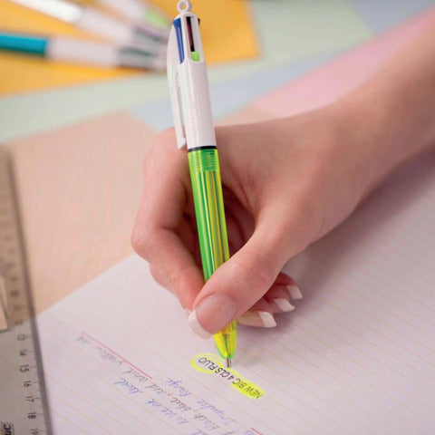 La pratica penna 4 Colours Fluo è dotata delle tradizionali punte a sfera blu, nera e rossa. Ma al posto dell'inchiostro verde, ha una praticissima penna giallo fluorescente dalla punta leggermente più spessa rispetto alle penne classiche per evidenziare e cerchiare i concetti chiave. Il fusto dal design ampio e rotondo non solo offre uno strumento di scrittura pratico e utile, ma è anche moderno e trasparente, così da poter controllare i livelli d’inchiostro per non rimanere mai senza.
