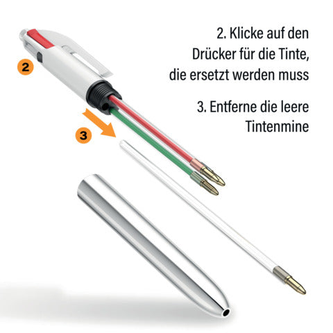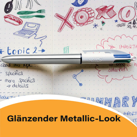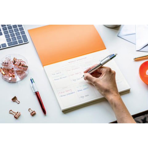 La nuova interpretazione di un classico senza tempo. La BIC 4 Colours Shine è una versione elegante, moderna e metallizzata della tradizionale penna BIC 4 Colours. Confezione assortita con 2 pezzi per differente colore del fusto (oro, argento, rosso, blu, viola, rosa). Nel 1970, l’imprenditore francese Marcel Bich ha creato la BIC 4 Colours Original a sfera, una penna che cambia colore con un clic senza bisogno di cambiare penna. Per alcuni rappresenta la penna di fiducia, per altri uno strumento di lavoro. È impossibile non riconoscere il leggendario design della penna BIC 4 Colours con il fusto circolare, la pratica clip per agganciarla ai bloc-notes o alla tasca della camicia e il distintivo buco per il cordino all’estremità. È fabbricata negli stabilimenti BIC in Francia grazie a un sapere consacrato dal tempo. Un’autentica BIC.
