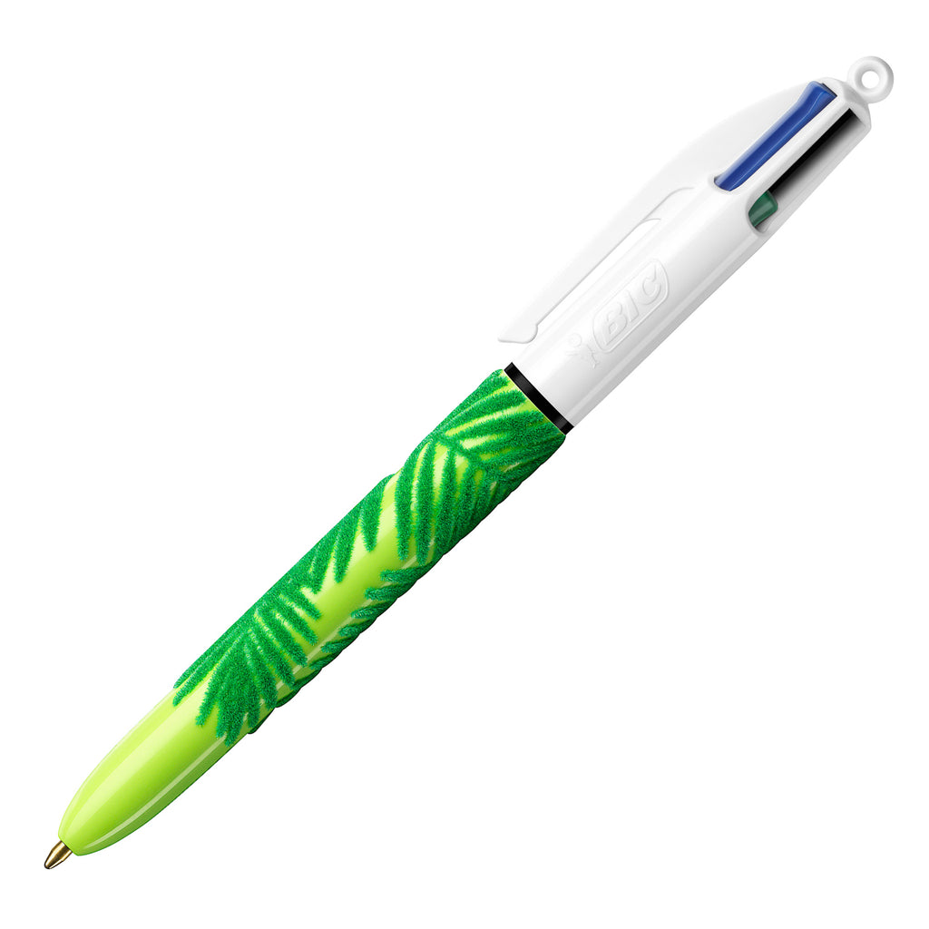 Penna a sfera 4 colori con inchiostri classici: rosso, verde, blu, nero. Punta da 1mm per un tratto di scrittura medio. Fusto con morbida decorazine in velluto in colorate fantasie (4 pz foglie, 4 pz fiori, 4 pz geko).