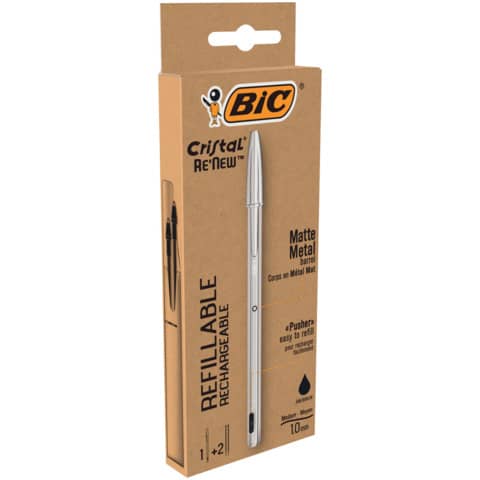 L'iconica penna a sfera Cristal in una versione unica dal fusto metallico. Un design sostenibile perché ricaricabile con un pratico pulsante per sostituire i refill (2 refill inclusi nella confezione). Cappuccio in plastica riciclata al 100%. Ogni refill scrive in media 3 km. Punta da 1 mm.