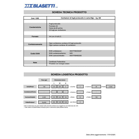 Fogli protocollo rigatura UB in carta non filigranata da 60 g/m2. Disponibili in pacchetto da 20 fogli. Formato A4. Questi articoli sono prodotti con energia solare.