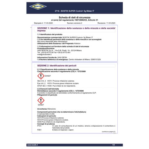 Adesivo liquido istantaneo, super forte e stabile! Bostik Super CONTROL+ è un adesivo liquido istantaneo e super forte in uno stabile contenitore da 5g che sta sempre in piedi da solo ed è dotato di innovativo Sistema Antigoccia: la quantità di colla desiderata può essere applicata facilmente grazie all’effetto “goccia controllata”. L’adesivo non cola e il Sistema Antigoccia garantisce un incollaggio facile, ma soprattutto preciso e pulito. Per la sua consistenza, l’adesivo scorre nei più piccoli angoli e nelle più sottili fessure. L’adesivo, se usato correttamente, è resistente all’acqua e ai lavaggi in lavastoviglie. Ideale per incollaggi di piccole dimensioni (non idoneo per incollare ampie superfici). Incolla quasi tutti i materiali solidi e flessibili come, ad esempio, cuoio, varie materie plastiche, fra cui PVC (cloruro di polivinile) rigido, ABS (acrilonitrile-butadiene-stirene, stirene resistente agli urti), PS (polistirene), resine acriliche (Plexiglas®), policarbonato (Makrolon®), resine fenoliche (Bakelite®), porcellana, ceramica, legno, metallo, sughero, feltro, tessuto (prima eseguire un test di idoneità), gomma. Solo parzialmente adeguato su vetro (dopo un certo periodo di tempo, l’adesivo tende a diventare friabile e a indebolirsi). Non indicato per PE, PP, resine siliconiche e gomma (Si), PTFE, Teflon®, styrofoam, indumenti in pelle e tessuto. Contenitore che sta in piedi da solo. Innovativo sistema antigoccia, non cola, incollaggi precisi e puliti, super forte e istantaneo, resistente all’acqua e ai lavaggi in lavastoviglie