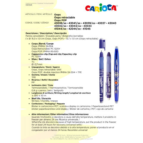 Penne cancellabili OOPS con inchiostro termosensibile punta media 0,7 mm. Impugnatura ergonomica triangolare. Doppia gomma. Disponibili refill compatibili. Confezione da 12 pezzi.