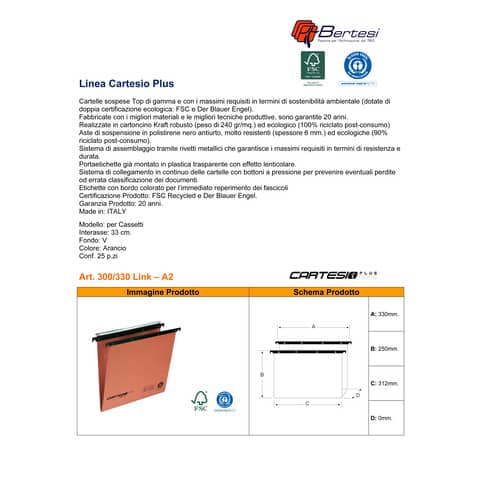 Cartelle sospese Top di gamma e con i massimi requisiti in termini di sostenibilità ambientale (dotate di doppia certificazione ecologica: FSC® e Der Blauer Engel).Fabbricate con i migliori materiali e le migliori tecniche produttive, sono garantite 20 anni.Realizzate in cartoncino Kraft robusto (peso di 240 gr/mq.) ed ecologico (100% riciclato post-consumo).Aste di sospensione in polistirene nero antiurto, molto resistenti (spessore 6 mm.) ed ecologiche (90% riciclato post-consumo). Sistema di assemblaggio tramite rivetti metallici che garantisce i massimi requisiti in termini di resistenza e durata.Portaetichette già montato in plastica trasparente con effetto lenticolare (100% riciclato post-industriale) lungo 31 cm. Sistema di collegamento in continuo delle cartelle con bottoni a pressione per prevenire eventuali perdite od errata classificazione dei documenti.Etichette con bordo colorato per l’immediata individuazione dei fascicoli.Interasse 33 cm. fondo a V. Conf. 25 p.zi - Colore Arancio.Certificazione Prodotto: FSC® Recycled e Der Blauer Engel.Garanzia Prodotto: 20 anni.39 Cm