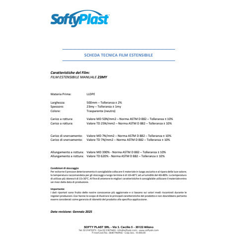 Film estensibile in bobina da 23 µm. Peso 2,5 kg. Anima 750 g. H. 50 cm. Tolleranza +/-10%.