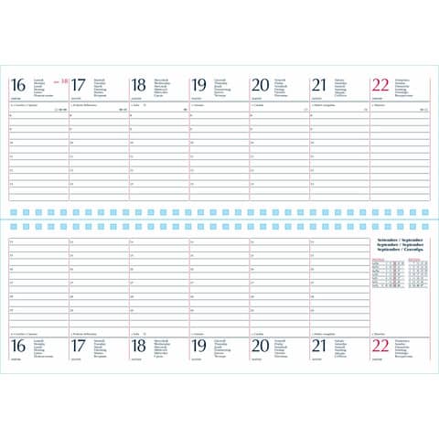 Planning spiralato, formato 29,8 x 10,5 cm, colore rosso inglese. Carta bianca da 70 grammi, stampa a 2 colori, lingue I-GB-F-D-E-RUS, 128 pagine compresa rubrica stampata. Copertina cartonata, angoli quadri, rivestita in Madrid, stampa millesimo a secco e pastello oro, spirale nera, piedino sporgente.