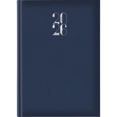 Agenda Settimanale 17x24 cm blu. Carta bianca da 70 gr, stampa a 2 colori, lingue I-GB-F-D-E-RUS, 128 pagine compresa rubrica stampata. Copertina imbottita, angoli quadri, dorso tondo, stampa millesimo a secco e pastello oro.