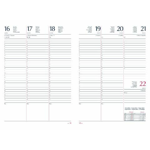 Agenda Settimanale 17x24 cm rosso inglese. Carta bianca da 70 gr, stampa a 2 colori, lingue I-GB-F-D-E-RUS, 128 pagine compresa rubrica stampata. Copertina imbottita, angoli quadri, dorso tondo, stampa millesimo a secco e pastello oro.
