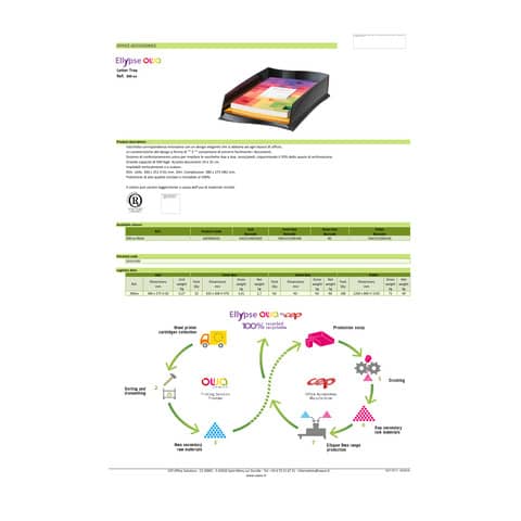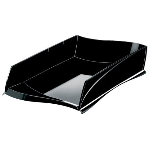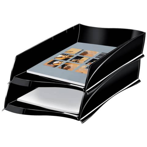 Vaschetta portacorrispondenza innovativa ed elegante. Finitura lucida. Le caratteristiche del design a forma di ''S'' consentono di estrarre facilmente i documenti. Capacità elevata: 500 fogli. Si possono archiviare documenti fino a 24 x 32 cm. Può essere impilata verticalmente, a scalare o testa/coda per lavorare faccia a faccia. Dim. 380 x 275 H 82 mm. Realizzata in polistirene antiurto con + 90% materiale riciclato, 100% riciclabile.