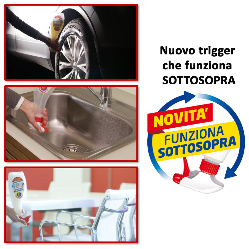 Nuovo chante clair disinfettante dalla formulazione superefficace anche sullo sporco vegetale incrostato. La migliore formula di sempre! nuovo trigger upside down che funziona sottosopra consentendo di arrivare negli angoli piu' difficili e nascosti e di utilizzare il prodotto fino all'ultima goccia. Lo sgrassatore universale disinfettante chante clair unisce un'efficace azione sgrassante ad una completa azione disinfettante di tutte le superfici trattate rimuovendo il 99,99% dei batteri
