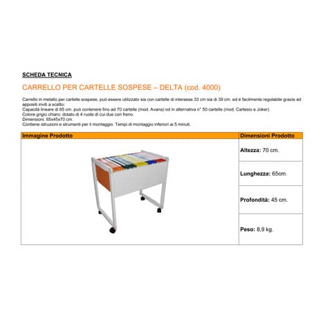 Carrello in metallo per cartelle sospese, può essere utilizzato sia con cartelle di interasse 33 cm sia di 39 cm. ed è facilmente regolabile grazie ad appositi inviti a scatto; Capacità lineare di 65 cm. può contenere fino ad 70 cartelle (mod. Avana) od in alternativa n° 50 cartelle (mod. Cartesio e Joker). Dotato di 4 ruote di cui due con freno. Dimensioni: 45x65x70 cm.Disponibile in colore grigio. Contiene istruzioni e strumenti per il montaggio. Tempi di montaggio inferiori ai 5 minuti.