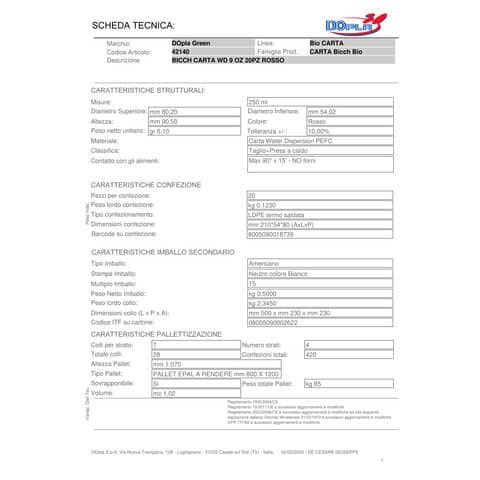 Bicchieri carta Water Dispersion rossi 250ml. Confezione da 20 pz. Diametro superore: 80,20 mm. Diametro inferiore: 54,02 mm. Altezza: 90,5 mm. Adatto al contatto con alimenti a Max 90° per 15'. No forni.