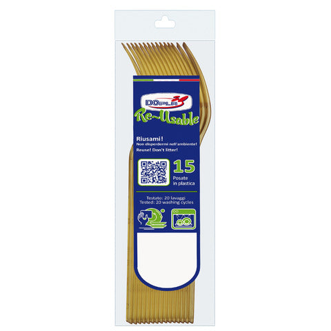 Forchette compact in polistirene. Colore: oro. Lunghezza: 180 mm. Peso netto unitario: 3,80 grammi. Idonee al contatto con alimenti fino a max 90° C per 15 minuti. Non utilizzabili in forno. Prodotti riutilizzabili. Testato 20 lavaggi in lavastoviglie. Confezione da 15 pezzi.