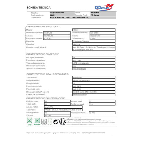 Bicchieri flutes in polistirene Diamant. Colore: trasparente. Formato: 120 ml. Diametro superiore: 54 mm. Diametro inferiore: 64 mm. Altezza: 162 mm. Peso netto unitario: 13,30 grammi. Idonei al contatto con alimenti fino a max 90° C per 15 minuti. Non utilizzabili in forno. Testato per 20 lavaggi in lavastoviglie. Riutilizzabili. Confezione da 10 pezzi.