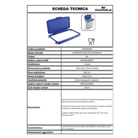 Coperchio per contenitore DURABIN 60, fissato alla cornice tramite cerniere. Posizionabile ad incastro sopra il contenitore. Praticità d'apertura e chiusura del coperchio che rimane fisso al contenitore. Adatto anche per lo stoccaggio di alimenti in quanto conforme alla normativa europea 1935/2004/EC.Giallo