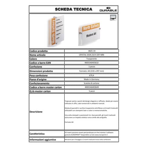 - Altre caratteristiche: con pannelli in acrilico trasparente antiriflesso e inserti traslucidi utilizzabili con stampanti laser a colori o monocromatiche. Gli inserti possono essere personalizzati on-line tramite il software gratuito DURAPRINT® disponibile sul sito www.duraprint.it .Minuteria per il fissaggio e 2 inserti traslucidi inclusi nella confezione