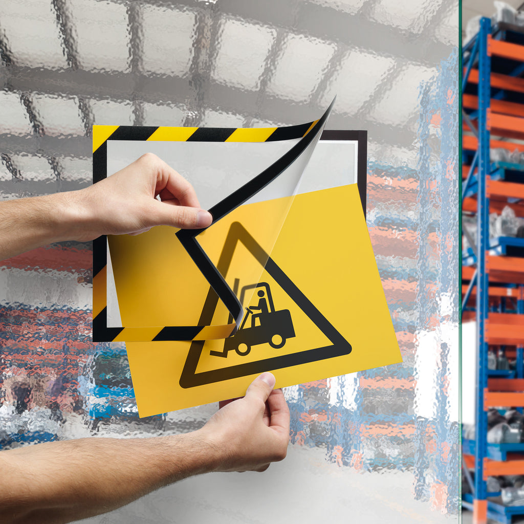 Dotata di pannello frontale magnetico antiriflesso. Applicabile su superfici lisce e solide ed e' rimovibile dalle superfici come il vetro. Cornice bicolore ideale per segnalazioni di sicurezza conforme alla normativa iso 3864-4. Puo' essere applicata in orizzontale o verticale e quando applicata su vetro i cartelli sono visibili da entrambi i lati. Sostituzione dell’inserto facile e veloce! formato a4.