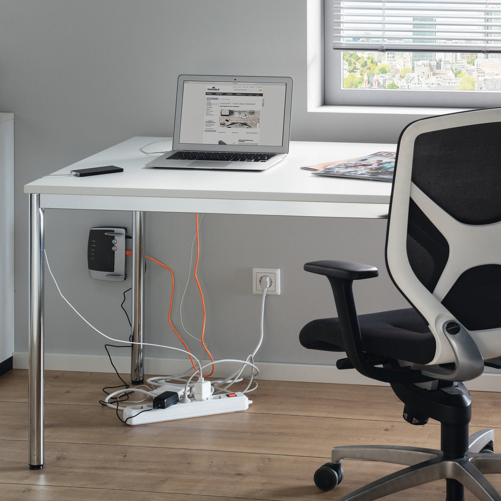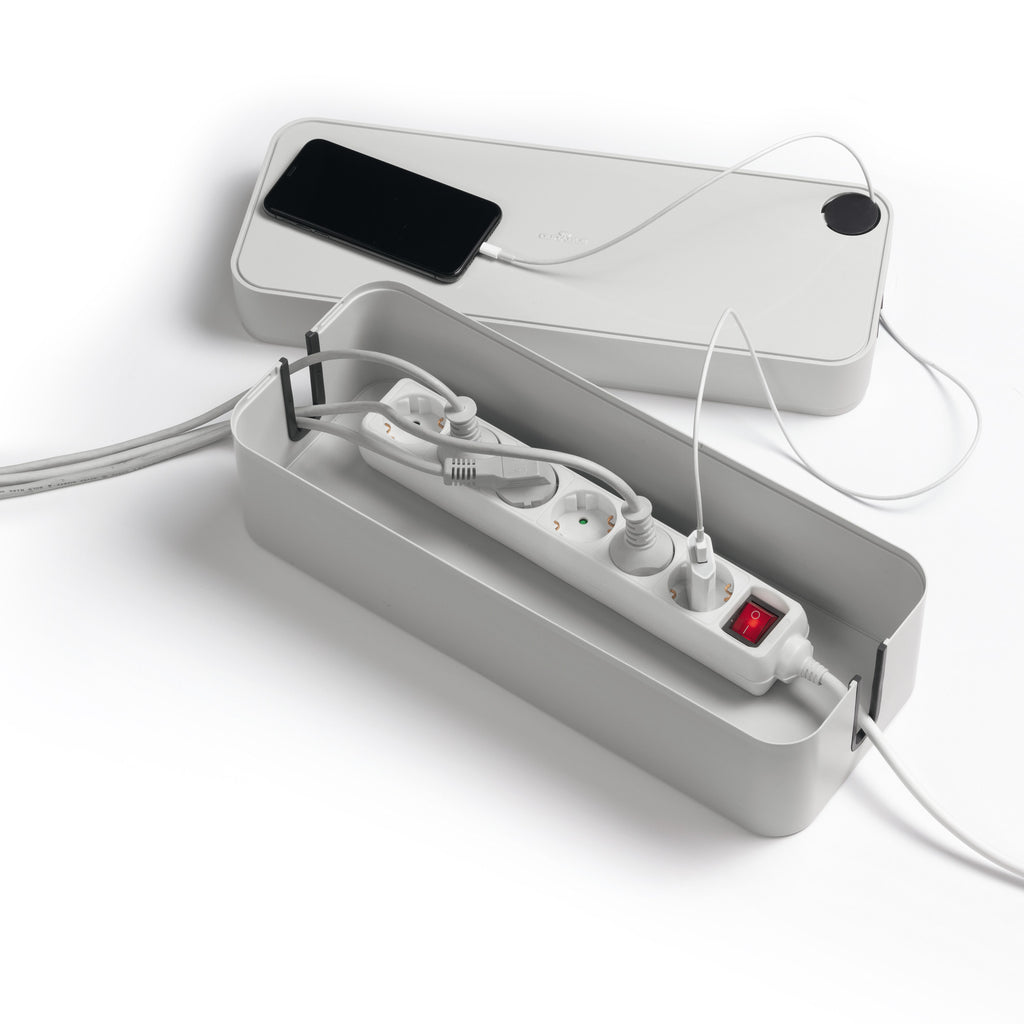 Scatola nascondi cavi dotata di due fessure laterali che consentono l’inserimento dei cavi e la circolazione ideale dell’aria. Il coperchio ha un’apertura richiudibile ideale per i cavi di ricarica dei telefoni cellulari. Puo' contenere i cavi e una presa multipla a 5 entrate.