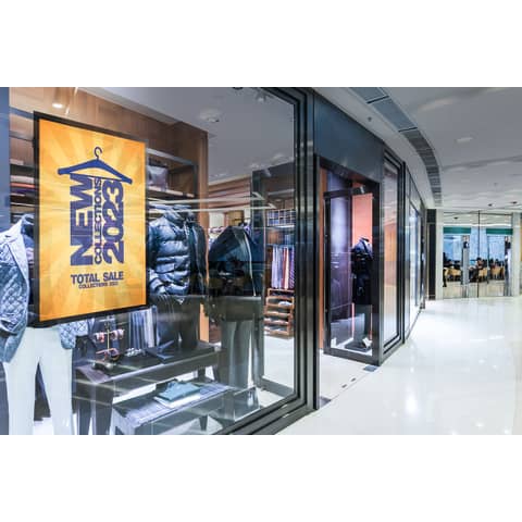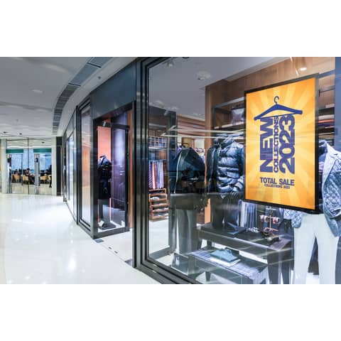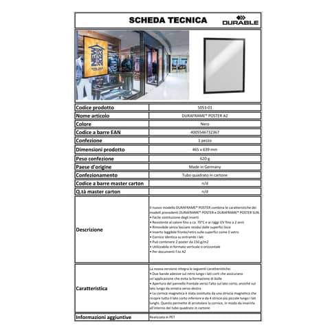 La cornice espositiva DURAFRAME® POSTER è ideale per esporre avvisi, ad esempio, su pareti, vetri e vetrine. I poster possono essere inseriti e sostituiti facilmente grazie alla cornice magnetica . Fissaggio senza bolle grazie alle due bande adesive sul retro. Rimovibile senza lasciare residui da superfici lisce e solide. Resistente al calore fino a 70°. Resistente ai raggi UV fino a 2 anni. Inserto leggibile fronte/retro su superfici in vetro. Capacità: 2 poster da 150g/mq. Cornice identica da entrambi i lati. Applicabile sia in formato verticale che orizzontale. Formato inserto: A2 (420 x 594 mm). Dimensioni esterne: 465 x 639 mm. Nero