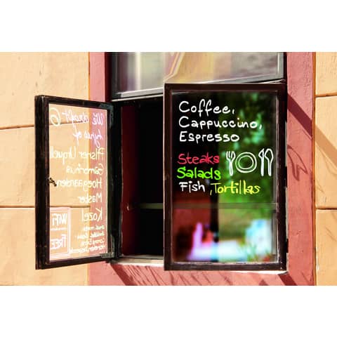 Marcatore gesso liquido punta a scalpello 4-15 mm. specifico per disegnare e scrivere sul vetro e/o sull'ardesia, ideale per decorare vetrine, finestre, specchi e oggetti in vetro. Inchiostro speciale a gesso liquido a base d'acqua, coprente, inodore e cancellabile da tutte le superfici non porose semplicemente con un panno umido. Flusso di inchiostro con controllo a valvola che garantisce la massima omogeneità di scrittura. Fusto in polipropilene riciclabile. Colore: blu.