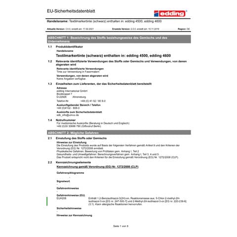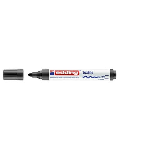 Marcatore per tessuti, punta conica 2-3mm. Adatto su quasi tutti i tessuti: lino, seta, cotone, jeans, iuta, tessuti misti e tanti altri ancora. Ideale per abbellire e personalizzare magliette, biancheria, borse, bavaglini e canovacci. Inchiostro a base d'acqua ad asciugatura rapida, completamente atossico ed estremamente resistente alla luce, all'acqua e allo sfregamento. Resistente alla stiratura ed ai lavaggi fino a 60°. Colore: nero.