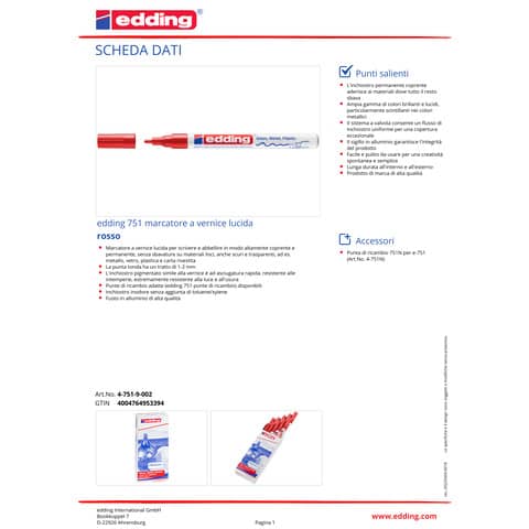Marcatore a vernice, punta conica 1-2 mm. Vernice pigmentata, coprente, permanente, inodore, con ''effetto smaltato'', ideale per dipingere, marcare, e scrivere anche su superfici scure e trasparenti. Asciuga rapidamente ed è estremamente resistente alla luce, all'acqua ed allo sfregamento. Il fusto in alluminio garantisce una perfetta conservazione a lungo termine dell'inchiostro. Punta in fibra sintetica Colore: rosso.