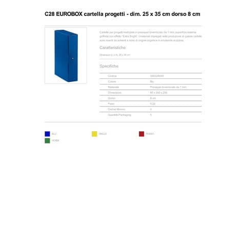Cartelle per progetti realizzate in presspan biverniciato da 1 mm; superficie esterna goffrata con effetto “Extra Bright”. I materiali impiegati nella produzione di queste cartelle sono esenti da solventi e sono di origine organica in emulsione acquosa. In presspan biverniciato, dorso 8 cm. Colore: blu.