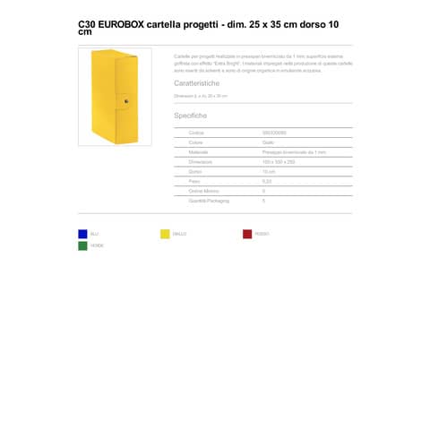 Cartelle per progetti realizzate in presspan biverniciato da 1 mm; superficie esterna goffrata con effetto “Extra Bright”. I materiali impiegati nella produzione di queste cartelle sono esenti da solventi e sono di origine organica in emulsione acquosa. In presspan biverniciato, dorso 10 cm. Colore: giallo.