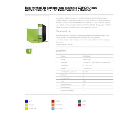 Il registratore Oxford rappresenta il simbolo dell’elevata qualità della produzione Esselte. Oxford è il registratore più venduto sul mercato italiano e vanta innumerevoli tentativi di imitazione. La resistente struttura in cartone da 2 mm rivestita di elegante carta goffrata, rende questo prodotto inconfondibile. Oxford si distingue per il raffinato rivestimento interno di colore pendant con la superficie esterna. Dorso: 8 cm. Modello Commerciale. Meccanismo N.1. Colore: verde lime.