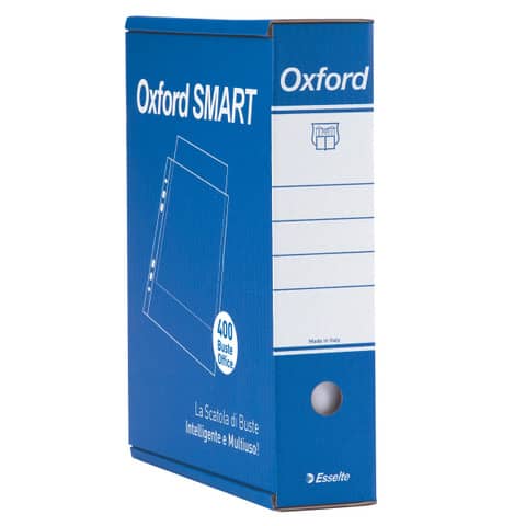 Scatola di buste forate in pp nella speciale in cartone riutilizzabile. Il contenitore, grazie al sistema di chiusura, ai fori di presa e al disegn ispirato a oxford, si riutilizza come scatola archivio. Dimensioni della scatola: 22,3x31,5x8,5cm. Dimensioni contenuto 4x100 buste - liscio. Confezione da 400.
