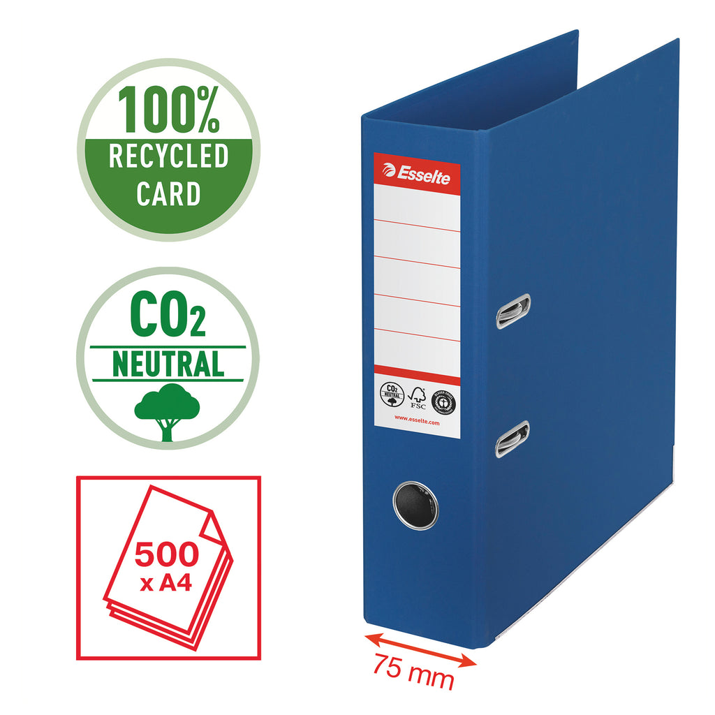 ''il raccoglitore con meccanismo a leva esselte n.1 power migliora l‘ambiente del tuo ufficio e l‘ambiente del nostropianeta. Certificato blue angel e fsc , realizzato in carta riciclata al 100%, riciclabile al 100% e a zero emissioni co2.dotato del meccanismo n.1 power, garantisce prestazioni superiori, viene fornito con 3 anni di garanzia ed e' disponibilein 6 vivaci colori.''