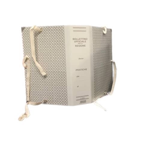 Faldone Bollettino Regionale con lacci occhiellati dorso 8 cm. in cartone da 1.8 mm. di spessore rivestito esternamente in carta monolucida litografata ad 1 colore. Risguardo interno in carta bianca. Lacci ripassati all'esterno per un corretto utilizzo. Misura lacci: larghezza 15 mm. lunghezza 260 mm.F.TO mm. 35x25 cm.Gazzetta Ufficiale