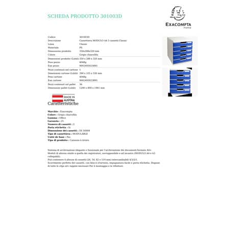 Cassettiera MODULO A4 5 cassetti Classic. Sistema di archiviazione elegante e funzionale per l'archiviazione dei documenti formato A4+. Moduli di altezza simile a quella dei registratori, sovrapponibile e ad incastro (MODULO A4 e A3 collegabili). Può contenere 4 altezze di cassetti (26, 54, 82 e 110 mm) intercambiabili 4/3/2/1. Scorrimento perfetto dei cassetti, con blocco d'arresto, impugnatura facile e porta etichetta. Dispone di tutte le clips ed i tappini necessari per il montaggio e le rifiniture.